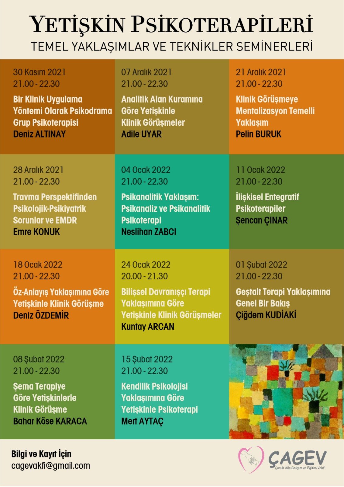 Birbirinden değerli yazarlarıyla, “Yetişkin Psikoterapileri Kuram ve Teknikleri” kitabımızın içeriğini tartıştığımız, seminer programımız 30 Kasım 2021’de başladı. Bu seminerlerde, psikoloji alanında geçmişten günümüze geliştirilmiş ve psikoterapide kullanılmakta olan teknik ve kuramlar teknik düzeyde anlatıldı, vaka örnekleriyle de çeşitlendirildi. Psikoloji camiamıza destek vermek amacıyla ücretsiz yapılan seminerler, yalnızca ruh sağlığı alanında ( psikiyatri, psikoloji, psikolojik danışmanlık) çalışan ya da öğrencilere açıktı ve Zoom üzerinden online gerçekleştirilecekti.